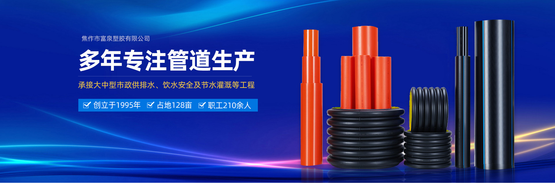 - 焦作市富泉塑膠有限公司,創立于1995年,是一家集研發、設計、生產、銷售為一體的大型管材企業。公司位于太極故里、黃河之濱一一河南焦作溫縣。公司占地128畝,現有職工210余人,其中具有中技術職稱的19人。生產、檢驗設備58臺(套),包括PVC實壁管生產線11套、PE實壁管生產線12套、HDPE雙壁波紋管生產線6套、PVC雙壁波紋管生產線5套,檢驗設備14臺(套)。主要產品有:Φ20mm-630mm、各種壓力規格的PVCU、PVC-M、PE給水管材,PVC-U節水灌溉管材,HDPE燃氣和礦用管材,DN200-800mm的HDPE、PVC雙壁波紋管及各種噴灌、滴灌工程材料。承接大中型市政供排水、飲水安全及節水灌溉等工程?! 「蝗苣z公司重視產品的質量、安全、環保和節能,在同行業中率先完成了“新華節水產品認證”,全方面通過ISO9001:2008國際質量管理體系、IS014001:2004環境管理體系和OHSAS18001職業健康安全管理體系的一體化導入,并建立起規范的現代企業管理體系。公司以“質量”為先導,采用質量跟蹤、多環節把關的方法,組建具有行業水準的企業技術檢測中心,常年委托水利部節水灌溉設備檢測中心、河南省產品質量監督檢驗院對產品跟蹤檢測,并由中國人民保險公司承保產品質量。公司連續多年被河南省水利廳確定為“安全飲水設備、節水灌溉設備”定點生產企業,并獲得“中國名優產品”“質量、服務、信譽AAA企業”“河南省**產品”“河南省水利企業”“河南省守合同、重信用企業”等榮譽稱號。 富泉塑膠公司堅持“用戶為上”的服務理念,長期以來,全方面關注客戶價值,不斷提升服務水平。服務隊伍常年為客戶的產品設計、施工、安裝提供合理的方案和全程細致、周到、**、快捷的技術服務。公司自成立以來,一直堅持以人為本的宗旨,塑造企業形象,并致力于新產品的開發,憑借雄厚的技術開發能力,先進的工藝制造流程,嚴格的質量管理保證體系,優良的售后服務網絡,已成為河南省大的飲水、灌溉及排水管材設備制造商。產品暢銷全國,而且還以公司雄厚的綜合實力在業界中占據著重要的地位。